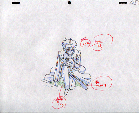 Meanwhile, my friend(who I'd managed to e-mail via stolen time on the library computer at my school. I got caught doing it too. It's from episode 165 'Crystal no Kagayaku Toki Utsukushiki Yume no Chikara' the second to last episode of the SS season. (Sorry, I don't remember its dub name.) Helios has brought the ailing Mamoru into a dream to show him The Golden Kingdom.(Is this Elysian/Illusion? Or the kingdom of the past Earth?) Mamoru transforms into Prince Endymion (woo hoo!) and babbles on about fighting for your dreams and Helios kneels to him. Oddly, during the scene Helios and Endymion are never in focus at the same time, Endymion going blurry when the camera pans to Helios and vice versa. The cel is comprised of two layers, A-1 being Helios and C-2 being Endymion. I wonder what the B layer was? Perhaps it was a fog layer or shadows? Background is actually my mousepad which I scanned behind the cel. ^^; (Anyone know of a sweatdropping emoticon?) The scan for this cel is actually pretty good, all considering. The blues & greens are still off, but it's nowhere near as bad as some of my other scans.