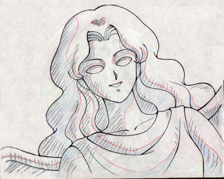 Also included was the matching sketch, unfortunately stuck to the cel, but fortunately stuck facing out. The lines to the douga are really thick and dark, much more so then any other cel I've seen. The top of the sketch was also folded over and taped down for some reason.