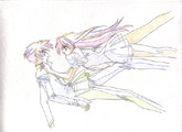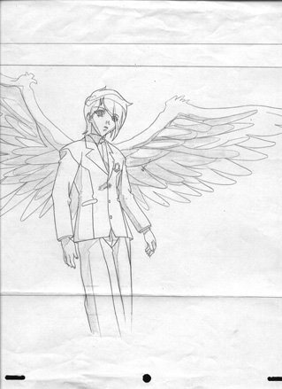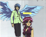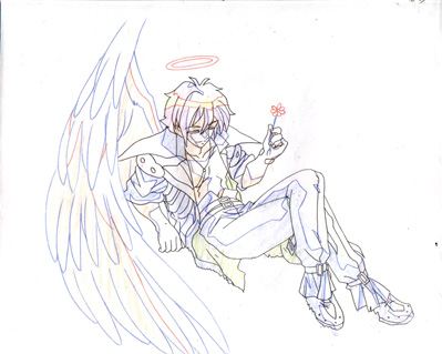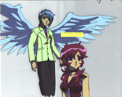 ![]() Tenshi ni Narumon Sara and Mikael rising towards heaven, final episode. Yellow bar of writing is sticker on celbag, not present on cel. Oversized Mikael sketch, does not fit fully on scanner. $120 NFS
