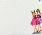![]() Sailor Moon Mamoru talking to Chibi Usa with Sailor Pluto looking on, revelation of talisman's episode in mid-season for S. Sketch is stuck to cel. Black marks on Mamoru's face in scan do not appear on actual cel. Copy of background available upon request $50